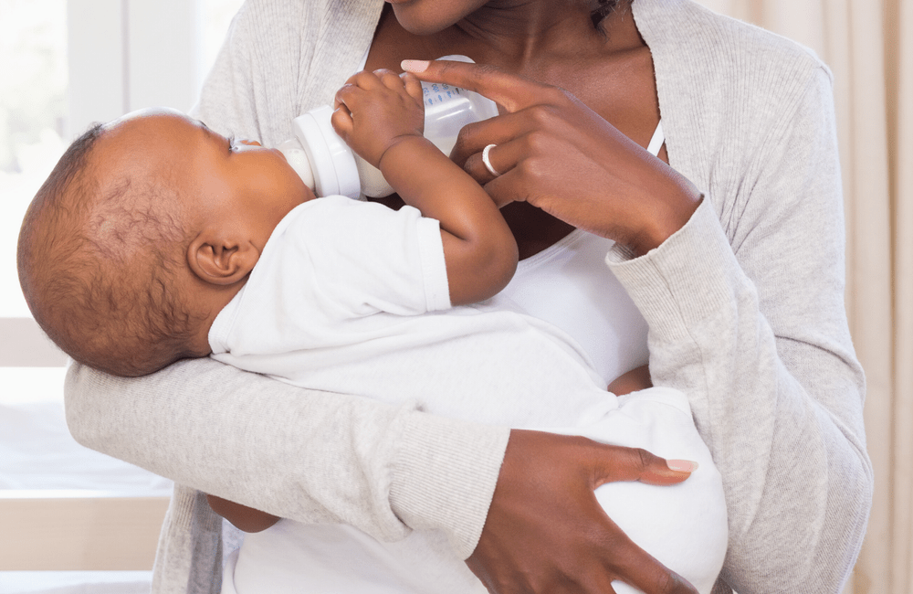 This is a photograph of a Black mother feeding her baby milk via a bottle with her left hand, while carrying her baby in her right arm.