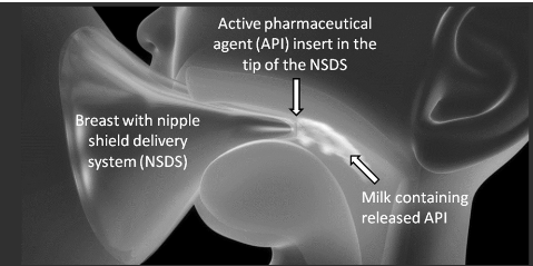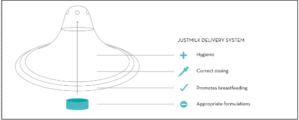 To address the problem, JustMilk created a thin silicone shield that the mother can place over her breast. On the tip of the silicone shield, is a tablet which rapidly disintegrates into the milk, while the baby is feeding on the mother. That way, the baby takes in the medicine without knowing, and since the medication is in the form of a pill, the mother does not have to worry about measuring the medicine out. Below is a diagram of the device as well as a picture showing how it works (JustMilk, n.d.).