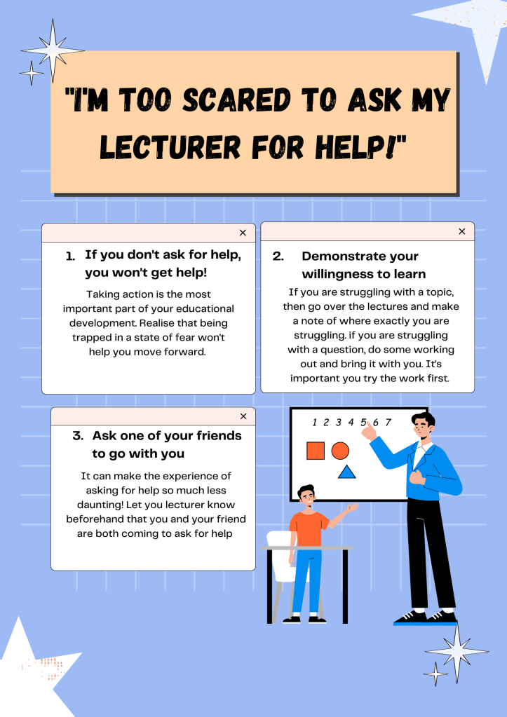 One day, you might walk out of a lecture feeling confused about what you have just learned. Or perhaps, you are doing some tutorial questions and feel stuck. Of course, you should look through your notes first to see if you can get to the right answer, but if you’re still struggling, ASK FOR HELP.